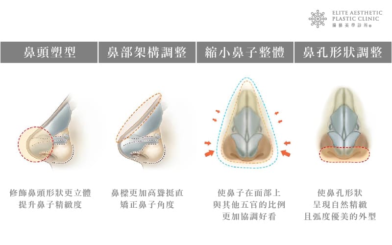 - 外觀:調整鼻樑高度、鼻頭形狀等美學問題