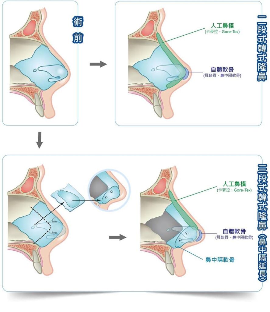 - 三段式隆鼻:則是以人工鼻膜(卡麥拉、人工骨或Gore-Tex)加強山根、鼻背等處,三段式隆鼻多了鼻中膈延長或是眉心墊高,因為較二段式多了一式,因此稱為三段式隆鼻!
