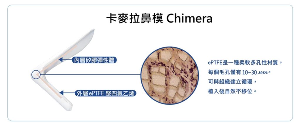 隆鼻使用的人工材料則有矽膠(Silicon)、Gore-Tex(聚四氟乙烯ePTFE)、卡麥拉鼻模(Chimera),以及人工骨(Medpor)。