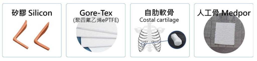 - 矽膠:一體成形和富有彈性,缺點是排斥性高,時間久了容易發生筴膜攣縮而變形。
