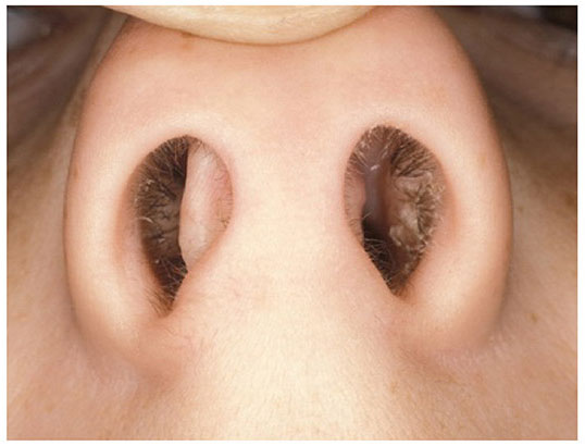 ▲尾端鼻中隔彎曲圖示,綠色區塊為尾端鼻中隔軟骨,若此處有彎曲情況,則稱為尾端鼻中隔彎曲。
