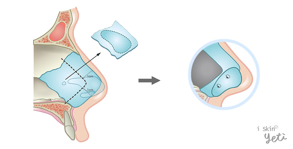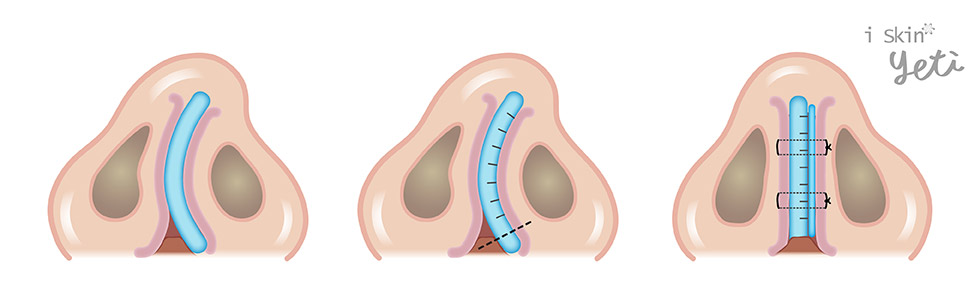 - 先於最彎曲的位置進行切開,然後將兩側軟骨重疊縫合,以確保對稱與穩定性。 可輔以鼻中隔軟骨移植(Batten Graft),進一步加強側邊支撐力,避免鼻部塌陷。
