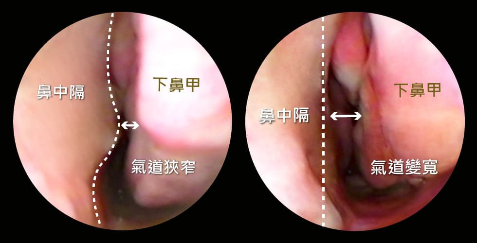 ▲手術前左圖: 透過鼻腔內視鏡檢查,可以看出鼻中隔彎曲及下鼻甲肥厚的症狀,鼻道空間很狹窄,難怪我常鼻塞QQ 手術後右圖: 經過治療後,下鼻甲體積縮小了,鼻中隔不再彎曲,鼻道空間變寬了,呼吸順暢到不行!