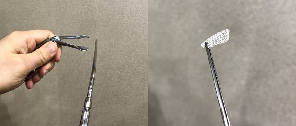 ▲左圖:醫師會用鉗子撐開鼻子,用吸引管清理術後分泌物與碎化的止血棉  右圖:接著為了預防出血,所以會貼上這層薄薄的止血敷料(Surgicel)