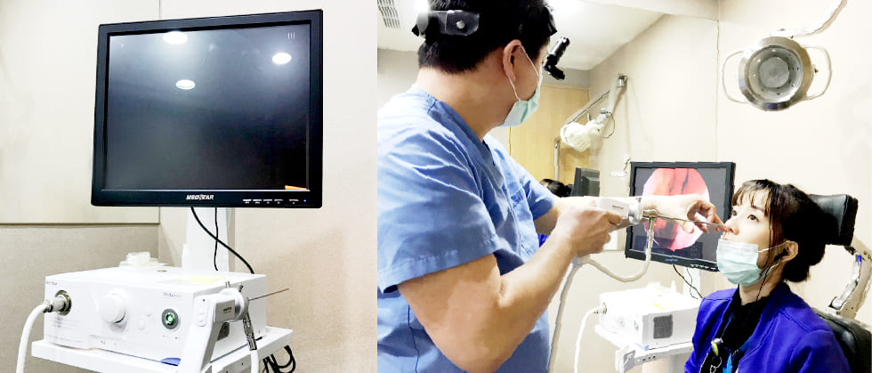 ▲左圖:這台就是鼻腔內視鏡,螢幕會顯示鼻腔內的狀況 右圖:醫師在檢查的時候就是像這樣,放心~放心~不會痛哦!